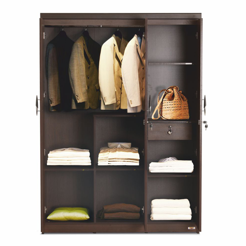 - Features : Ergonomically designed inner spaces for typical Indian use. Internal lockable drawer & pivot door provided for keeping accessories. Robust Constructin,15mm thick melamine board with protective PVC edges. Lifted above floor to avoid water contact. Shelves provided for storing clothes & other items. Decorative Profile provided on top and melamine handle provided for shutter. Long & short hanging space provided