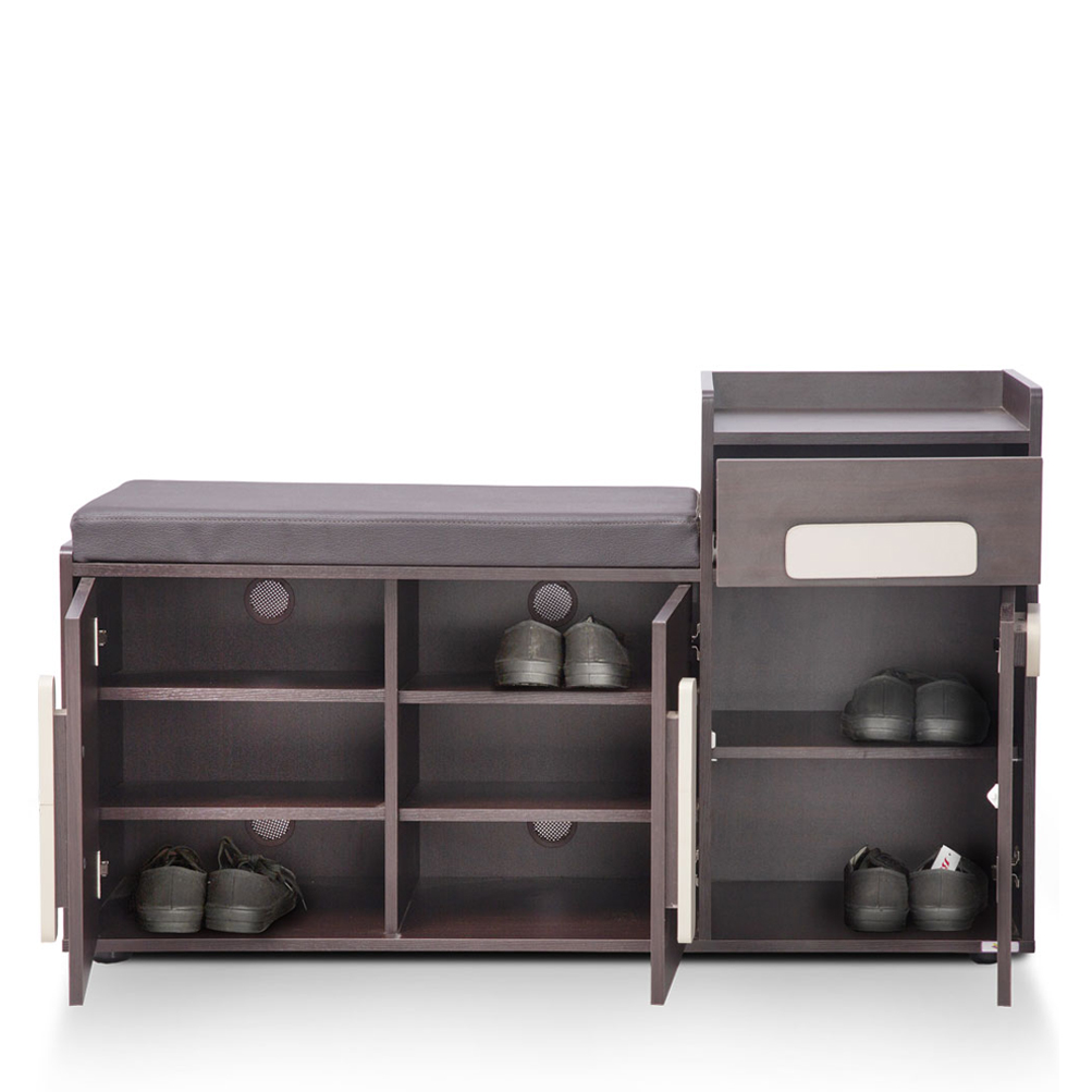- Features : very functional and pragmatic design.Can accommodated up to 8 pairs of shoes of various sizes.Seating provided for easy wearing and removed of shoes tow tone design,compact and space savings