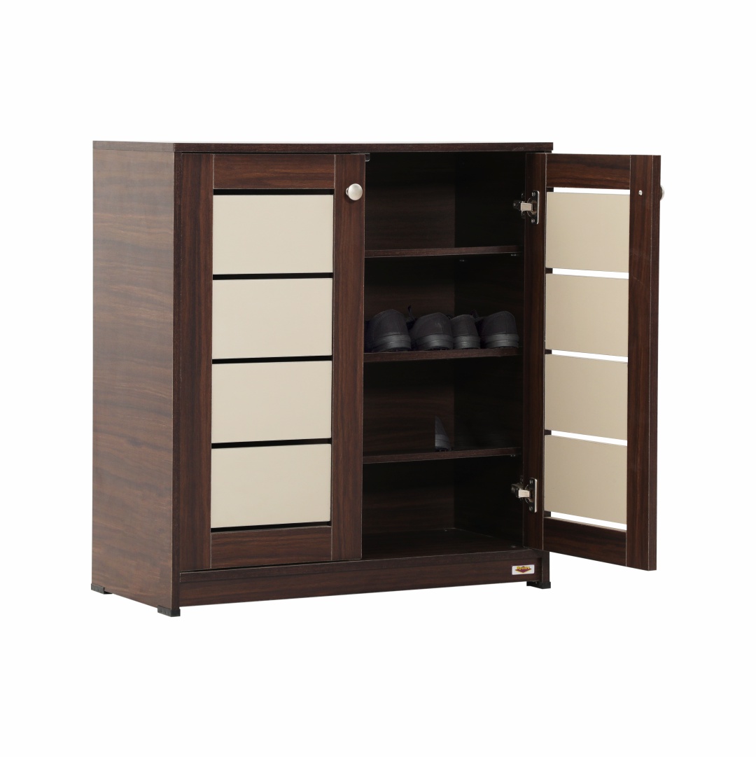Item Included : Shoe Rack with 2 Doors (PKSR 020) Primary Material : Melamine Faced Engineered Wood Style : Contemporary Finish: Melamine Features: 1. Compact Rack for Storing Footwear in Two Tone Design 2. The Inner Top and Bottom Shelf is Compact & Is Adjustable or Removable Type Shelf 3. The Inner Middle Shelf is Compact & Is Fixed Shelf 4. Two Tone Frame Shutters 5. No Sharp Corners