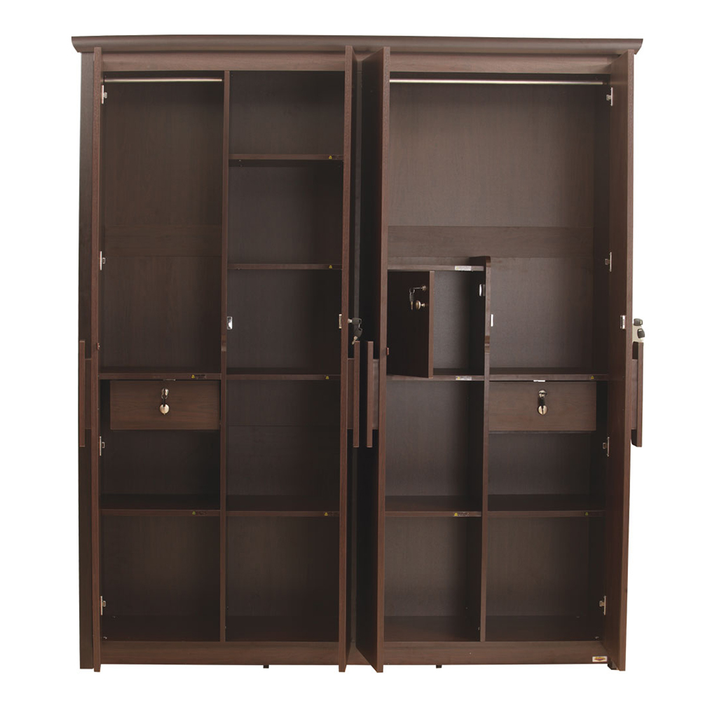 - Features : Ergonomically designed inner spaces for typical Indian use. Internal lockable drawer & pivot door provided for keeping accessories. Robust Constructin,15mm thick melamine board with protective PVC edges. Lifted above floor to avoid water contact. Shelves provided for storing clothes & other items. Decorative Profile provided on top and melamine handle provided for shutter. Long & short hanging space provided